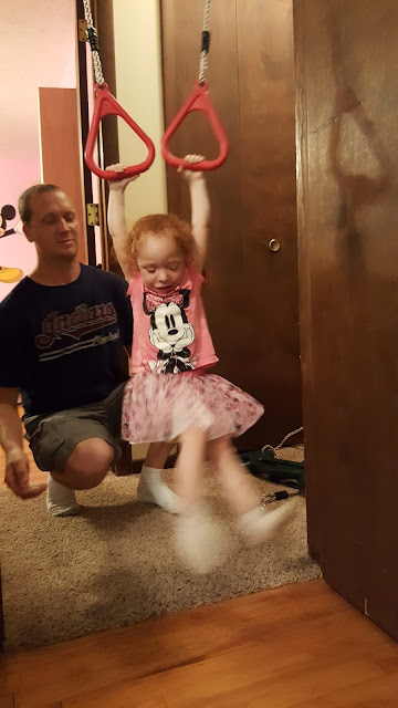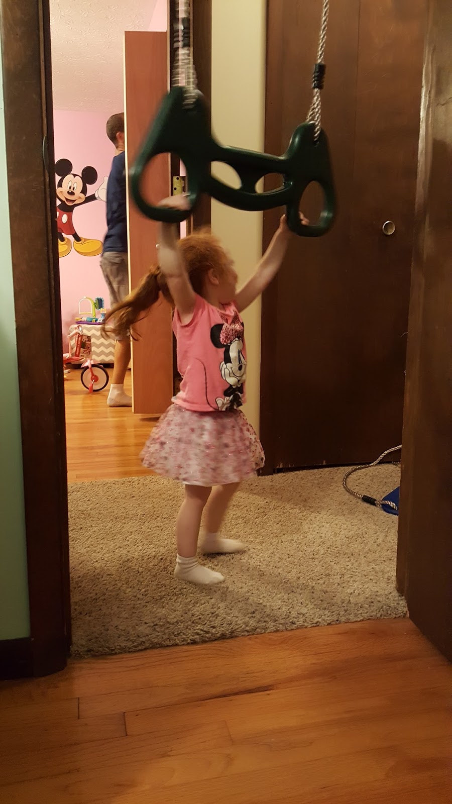 Trying out my new gorilla gym. I love it..I can swing, climb, trapeze, etc all in the house!